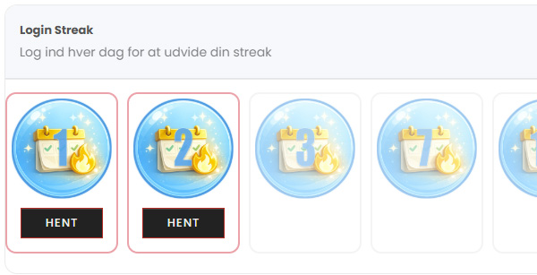 De to første bokse med rød ramme kan hentes, fordi vi har en login streak på to dage (vi har logget ind to dage i træk).